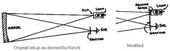 1936. Ingalls, Scientific American, Nov 1936. Ingalls describes comments from Hari Charan, Calcutta about a mirror figured using tests including a test with a Ronchi grating of 10 hairs per 1/10 inch.